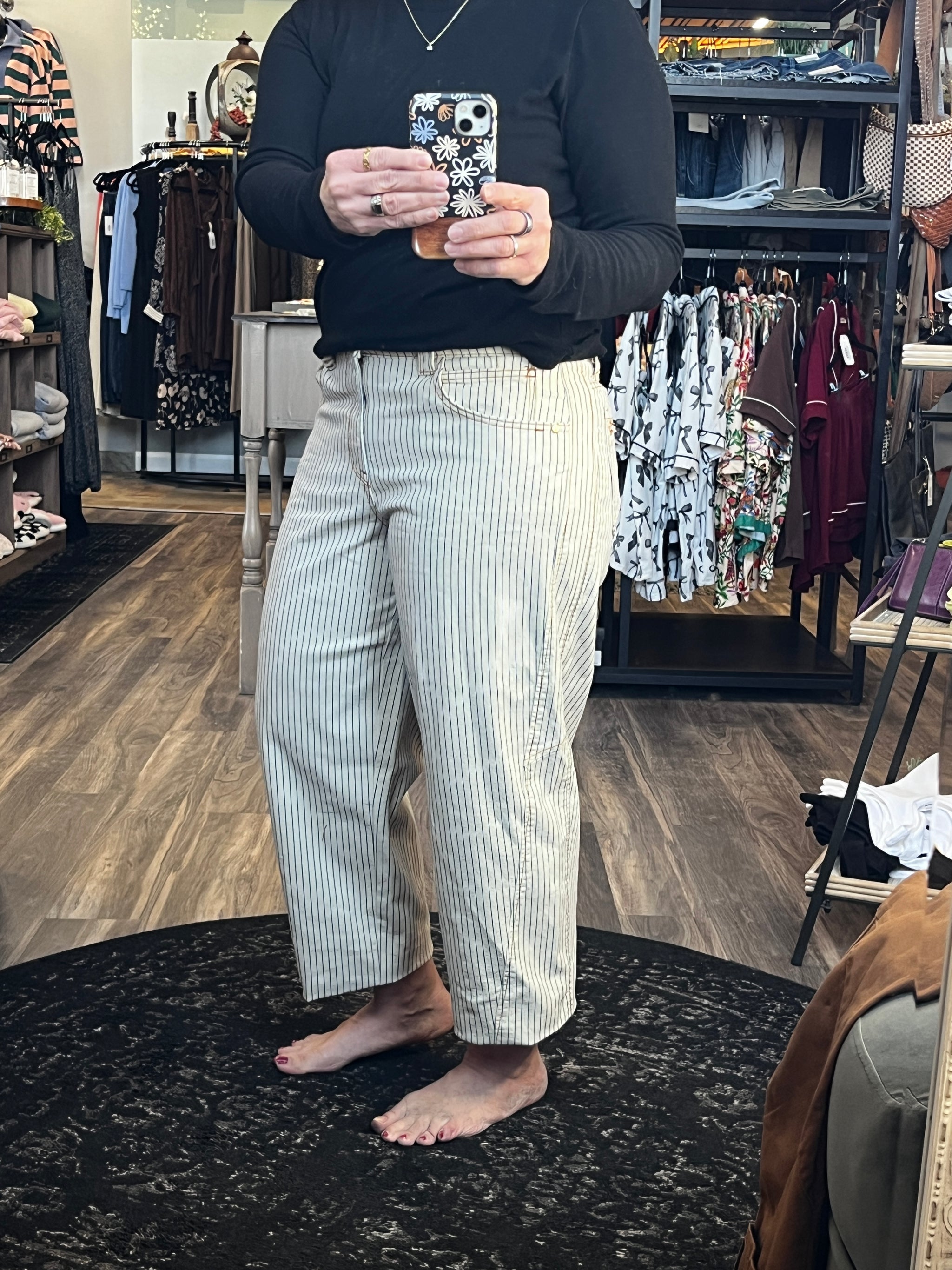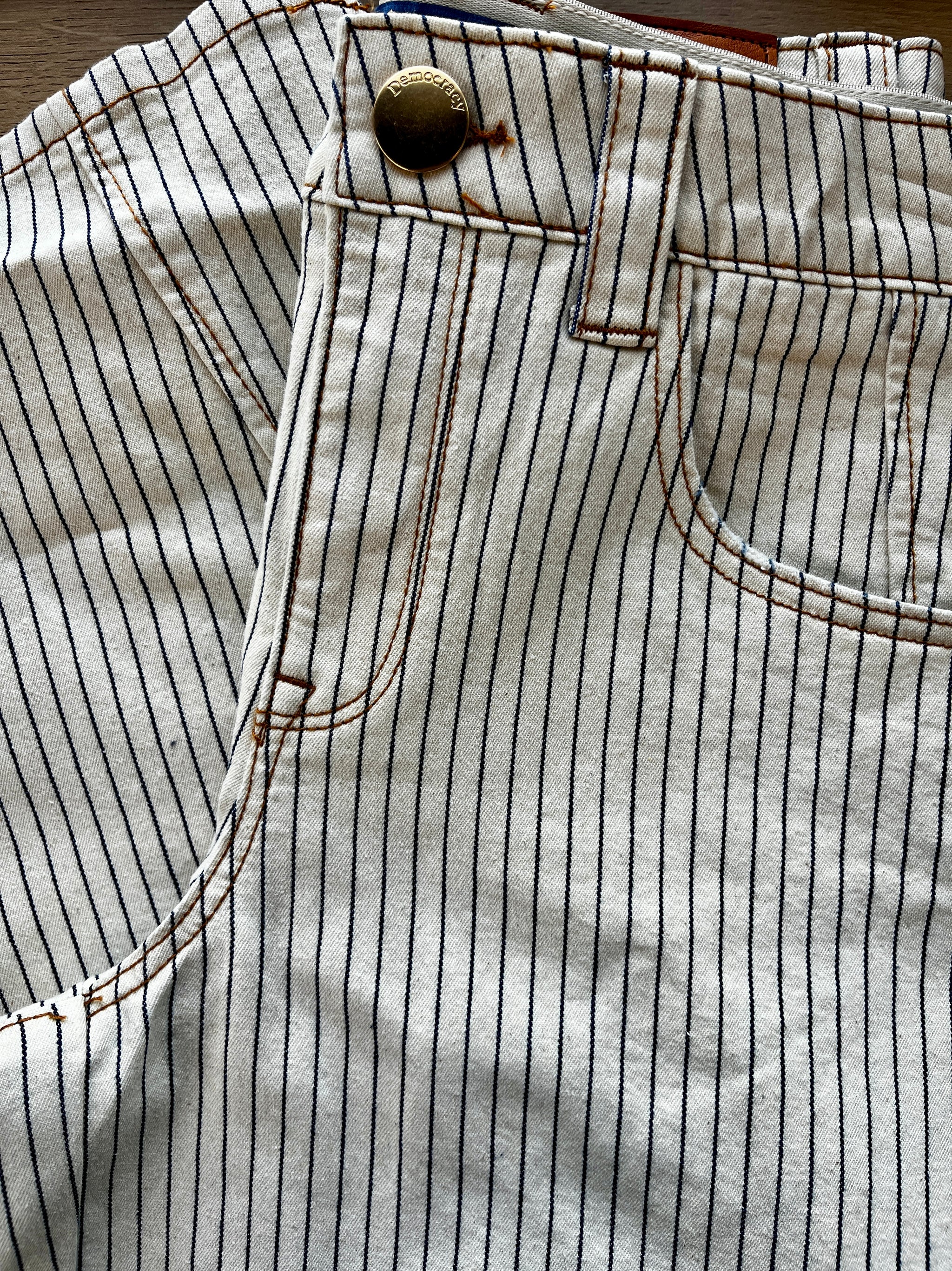 Elevate your denim collection with this refined Democracy Savannah Stripe design. Crafted in cream-colored denim with striking navy pinstripes and mustard stitching accents, this barrel leg silhouette offers a modern yet timeless appeal. The medium width cut provides comfortable everyday wear, while the stretching waistband ensures a flattering fit. Adjustable snap hemline allows you to customize the length to perfection. A versatile piece that transitions seamlessly from casual to polished occasions. Consider sizing down as they do run roomy.