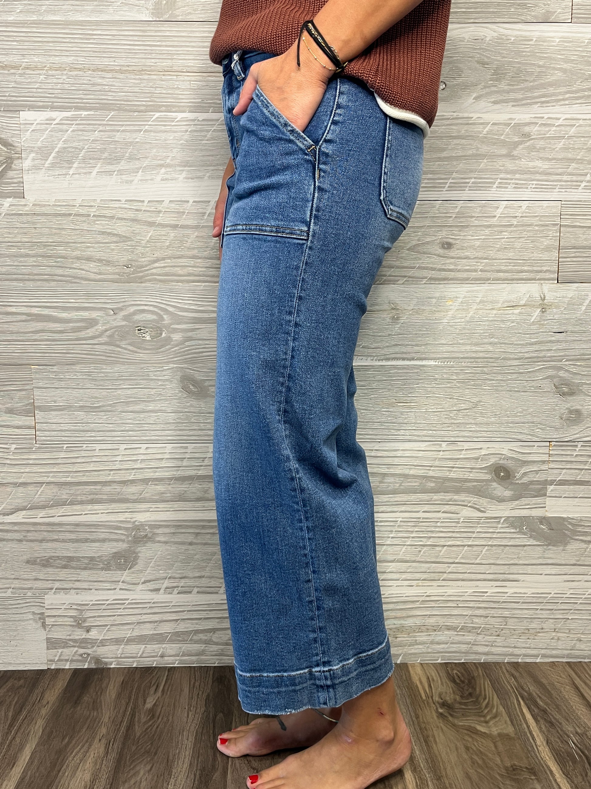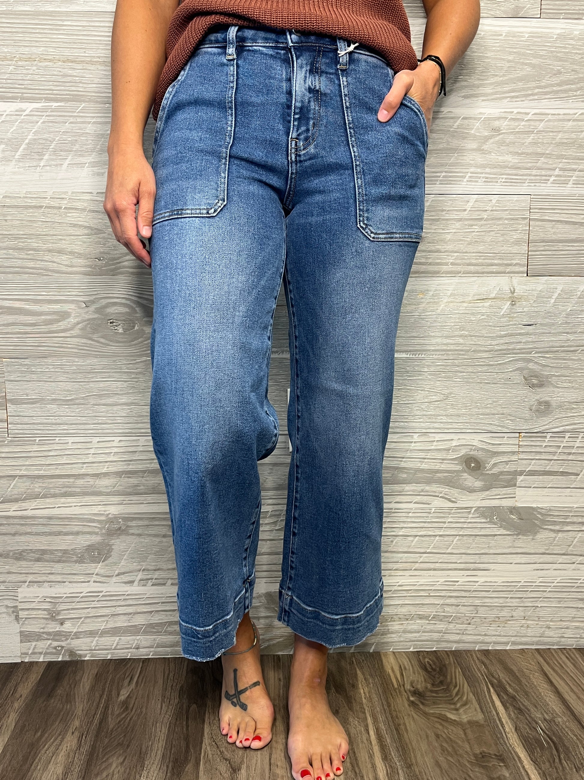 Step into effortless style with the Lovervet Magellanic Utility jeans. These high-rise, wide-leg denim beauties feature handy utility pockets and a trendy cropped length, blending comfort and function. Crafted from a soft cotton-poly-spandex blend, they move with you while keeping your look cool and casual. Perfect for days when you want to feel free and fabulous!