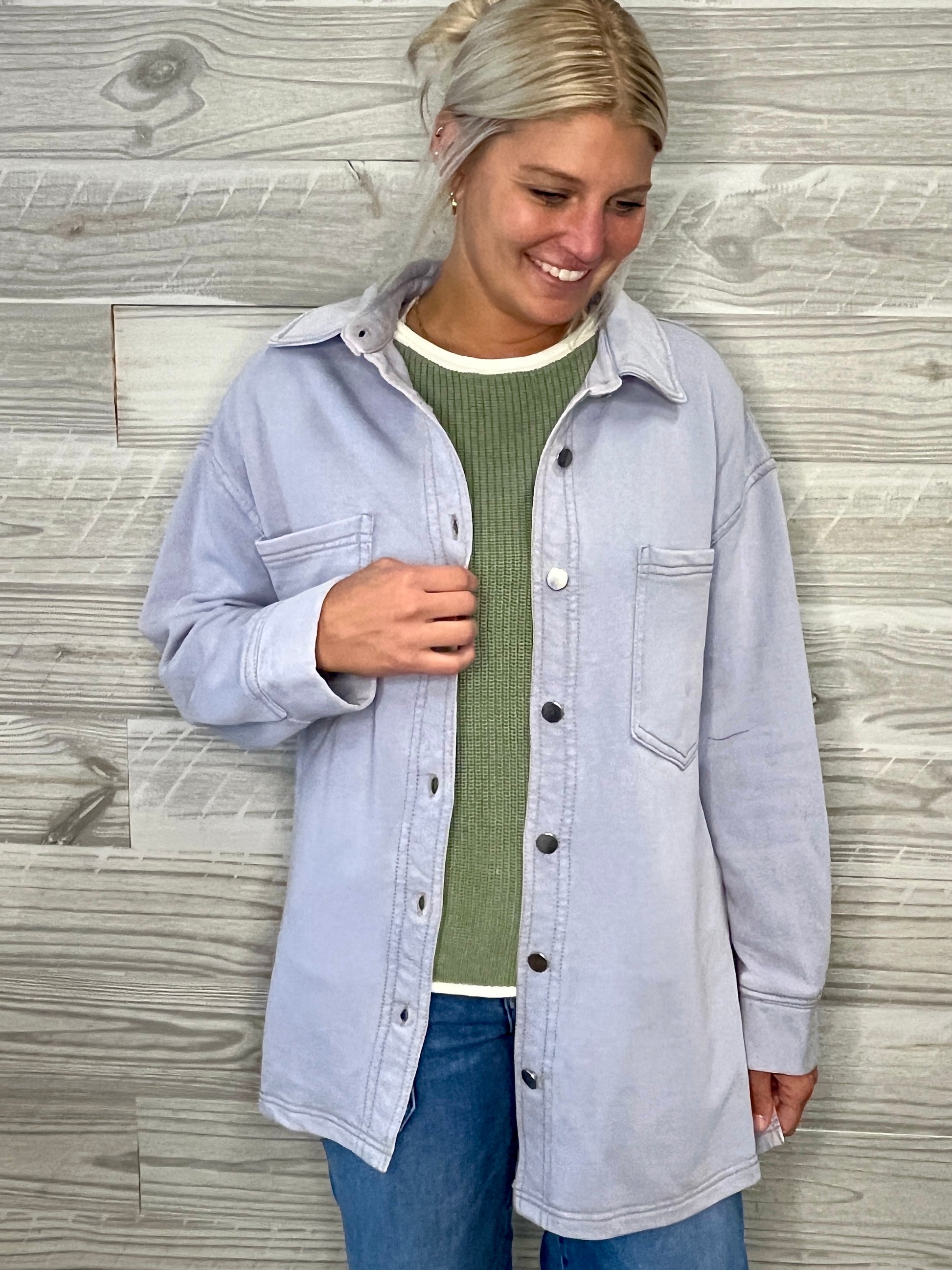 Elevate your wardrobe with the Lyssa Shacket in a refreshing fog blue. This oversized button-up features a classic collar, practical front chest pockets, and a stylish split hemline for effortless movement. Perfect for layering, it combines comfort and modern design to keep you looking effortlessly chic. Fit is oversized.