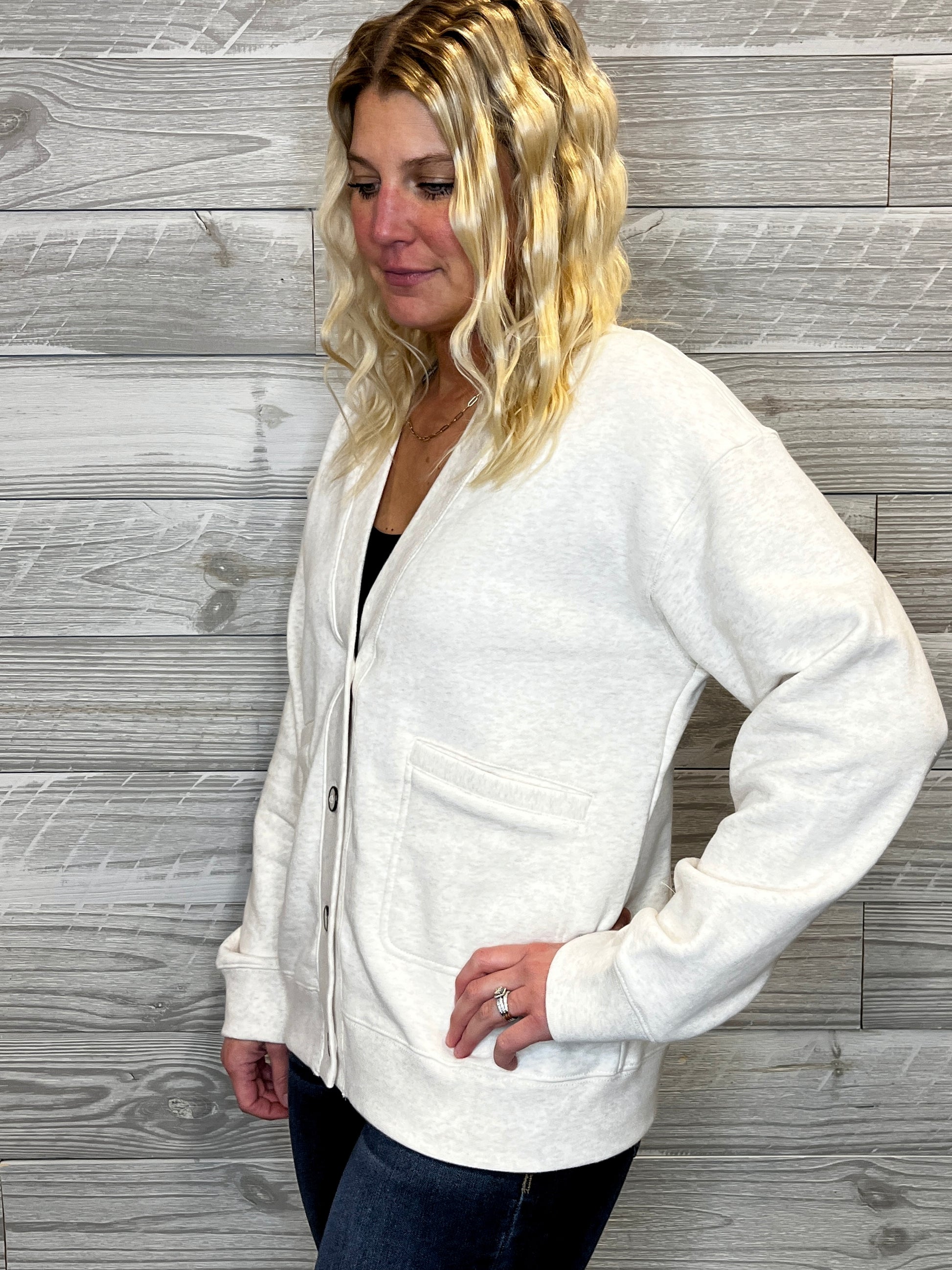 Wrap yourself in cozy comfort with The Serenity Cardigan, your new favorite layering piece. This oatmeal button-up features a soft sweatshirt material that feels like a warm hug, paired with a flattering V neckline and an extended hemline for effortless coverage. Practical front pockets keep your essentials close while you lounge, work, or explore. Perfect for those days when you want to feel put-together without sacrificing comfort. Fit is oversized.